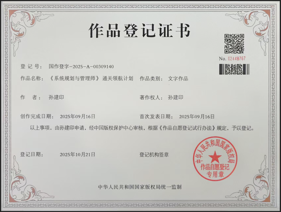 而在这半年里,我还有一个具象的收获:我自己原创的系规付费课程——“《系统规划与管理师》通关领航计划”,已经在10月份正式获得了国家版权局的作品登记证书。